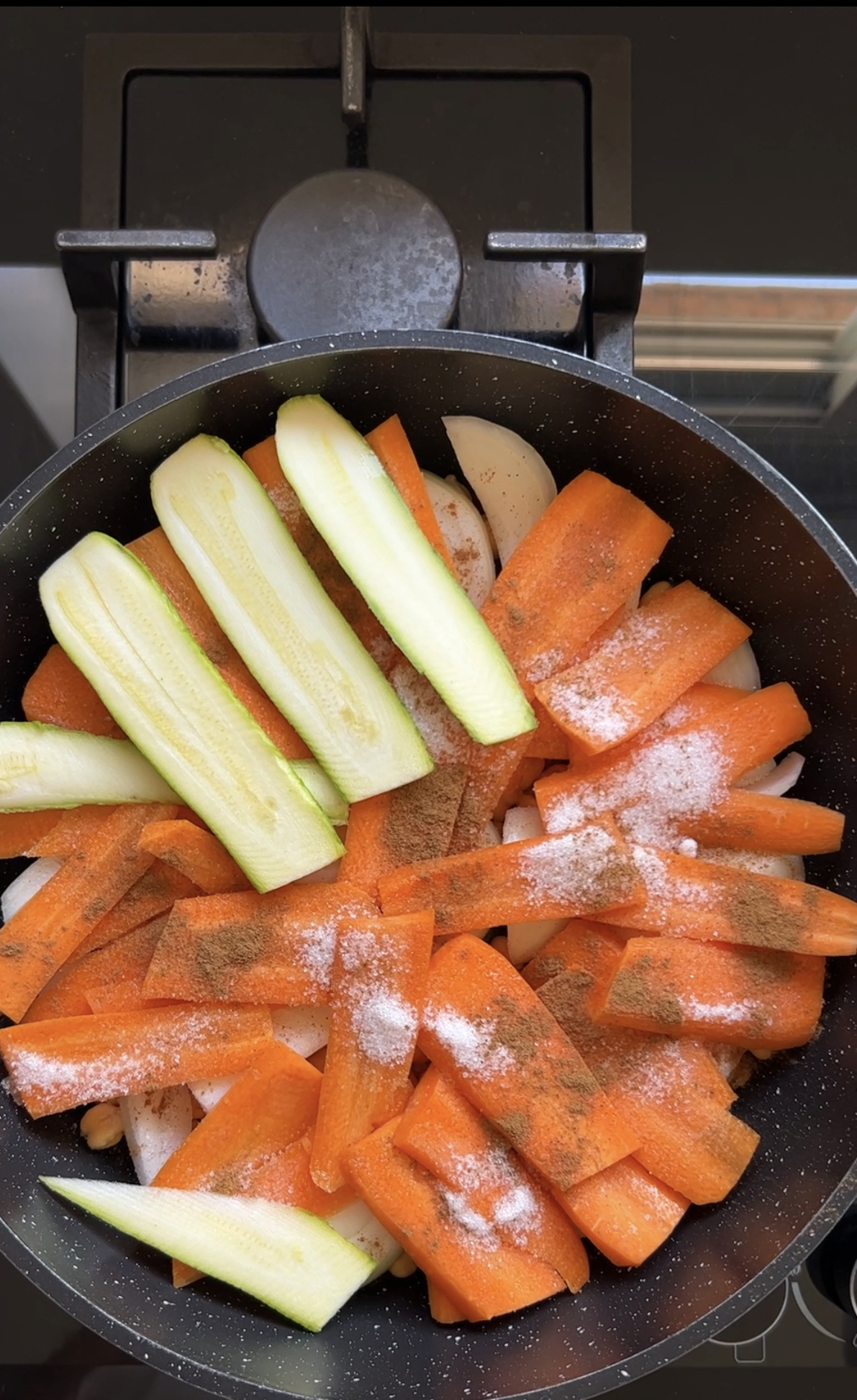 זו מעין קדרת ירקות מקורמלים בסוכר וקינמון מסודרים בשכבתות ובתחתית גרגירי חומוס שתמיד קצת נשרפים וזה טעים טעים טעים.